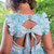 Das Kleid wird mit kleiner Knopfleiste auf dem Rückteil genäht. Die gerafften Flügelärmel sowie die Schleife sind optional.